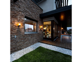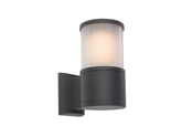 Venkovní nástěnné svítidlo, hliníková slitina elektrostaticky malovaná v tmavě šedé barvě se skelným difuzorem.