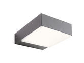Nástěnná exteriérová lampa vybavená LED diodami SMD a napáječem, hliníková konstrukce lakovaná v tmavě šedé barvě, opálový polykarbonátový difuzor.
