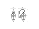 Venkovní nástěnné svítidlo, hliníková slitina antické černé a hnědé patiny, čirý skelný difuzor typu „vodní sklo“.
