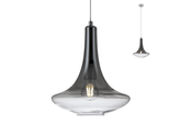 Závěsné interiérové svítidlo, chromová kovová struktura, skleněný difuzor v kouřově šedé barvě.