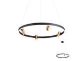 Závěsné interiérové svítidlo vybavené SMD LED diodami a orientovatelnými bodovými světly COB. Struktura z hliníku a kovu v pískové černé barvě a bodová světla s povrchovou úpravou v mosazné barvě. Opálový difuzor. Trojitá regulace světla: individuální pro kruh, individuální pro bodová světla současně pro oba zdroje.