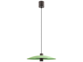 Závěsné interiérové svítidlo s přímým/nepřímým rozptylem světla, vybavené jednou COB LED a SMD LED, kovová konstrukce lakovaná pískově černou barvou, kovové stínítko lakované matnou zelenou, saténový akrylátový difuzor.