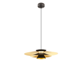 Interiérové závěsné svítidlo, vybavené SMD LED diodami, kovová konstrukce lakovaná v matné černé barvě na povrchu a matné zlaté uvnitř, opálový akrylátový difuzor.