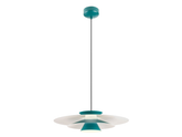 Interiérové závěsné svítidlo, vybavené SMD LED diodami, kovová konstrukce lakovaná v matné černé barvě a kovové difuzéry lakované v matné zelené barvě na povrchu a matné bílé uvnitř, opálový akrylátový difuzor.