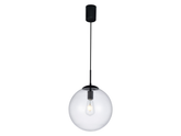 Závěsné interiérové svítidlo, galvanizovaná kovová konstrukce v matné černé barvě, průhledný difuzor z foukaného skla.
