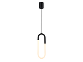 Závěsné interiérové svítidlo vybavené SMD LED diodami, kovová konstrukce lakovaná pískově černou barvou, průhledný difuzor z foukaného skla.