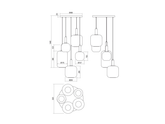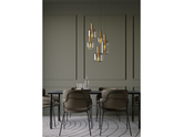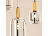 Závěsné svítidlo do interiéru, kovová konstrukce lakovaná pískově černou barvou s matnými zlatými detaily, difuzory z foukaného skla.