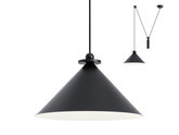 Závěsné interiérové svítidlo s nastavitelnou výškou, hliníková konstrukce - matná černá, difuzor z hliníku v matné černé zvenčí a matné bílé barvě zevnitř.