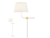 Stojanová lampa do interiéru, kovová konstrukce lakovaná v matné bílé barvě s matně zlatými hliníkovými detaily, bílé stínítko z textilu.