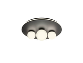 Stropní interiérové svítidlo vybavené SMD LED diodami, konstrukce z hliníku a kovu elektrostaticky lakovaná v pískové černé barvě s detaily z broušeného černého hliníku, stínítko z foukaného skla z opálu s kruhovým difuzorem z opálově bílého silikonu.