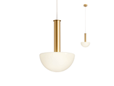 Závěsná interiérová lampa, kovová konstrukce v saténové zlaté barvě, foukané opálové sklo.