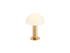 Stolní interiérová lampa, kovová konstrukce v saténové zlaté barvě, foukané opálové sklo.
