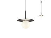 Závěsná interiérová lampa, matná černá lakovaná kovová konstrukce, foukané opálové sklo.
