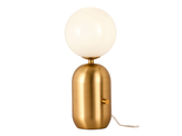 Interiérová stolní lampa, matná pozlacená kovová konstrukce, difuzor z foukaného opálového skla.