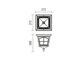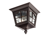 Venkovní stropní svítidlo, hliníková slitina antické černé a hnědé patiny, čirý skelný difuzor typu „vodní sklo“.