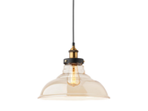 Interiérové závěsné svítidlo, kovová konstrukce, elektrostaticky nanesená černá barva se starožitnými mosaznými prvky, difuzor z jantarového foukaného skla.