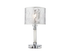 Stolní lampa, kovová chromová struktura, s průsvitnými skleněnými dekoracemi, stínítko ze stříbrné tkaniny.
