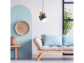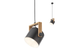 Orientovatelné závěsné interiérové svítidlo, struktura kovu lakovaná matnou černou a přírodním bukovým dřevem, kovový difuzor elektrostaticky lakovaný matnou černou zvenčí a bílou zevnitř.