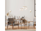 Závěsné interiérové svítidlo, matná zlatá lakovaná kovová konstrukce, difuzor z foukaného opálového skla.