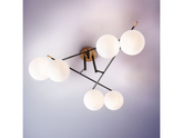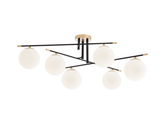 Stropní interiérové svítidlo, kovová konstrukce lakovaná v matné zlaté a matné černé barvě, stínítka z opálového foukaného skla.