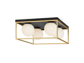Stropní interiérové svítidlo, matná černá lakovaná kovová konstrukce, mosazný kovový rám, opálové foukané skleněné difuzory.